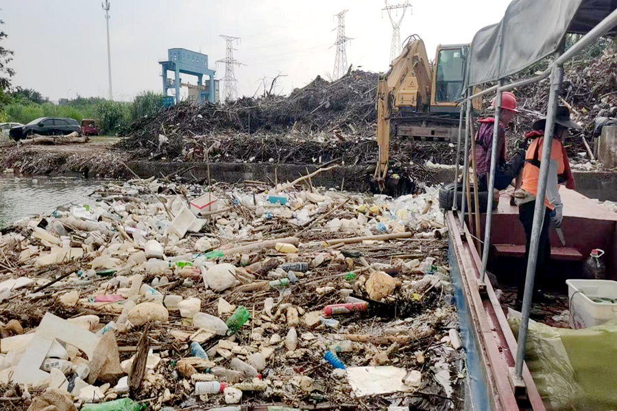 沅江风光带漂浮垃圾进行打捞现场