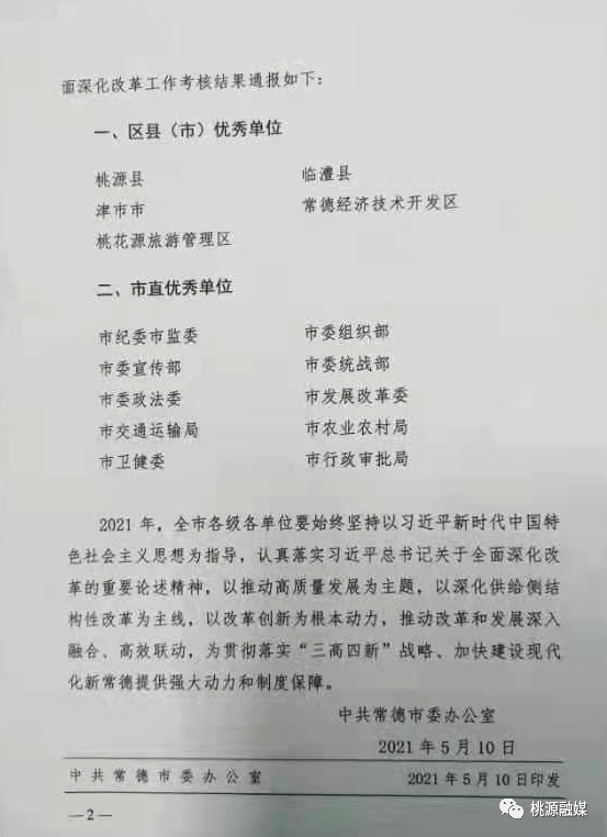 5月10日,中共常德市委办公室发出《关于2020年度全市全面深化改革工作考核结果的通报》,全市五个区县(市)获评先进单位,桃源县、桃花源旅游管理区名列其中。