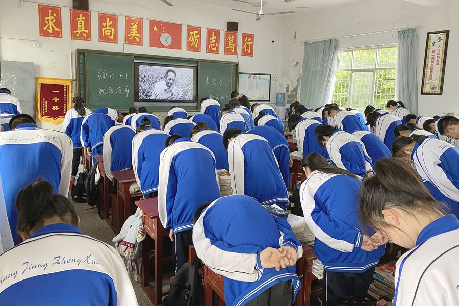 5月24日上午,桃源县漳江中学举行追思纪念袁隆平活动,学生们课前向袁隆平爷爷的遗像鞠躬。