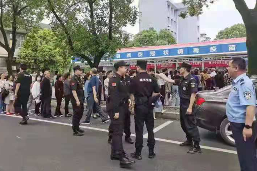 5月28日一早,桃源县公安局民(辅)警在县城某新冠疫苗接种点现场维持秩序。