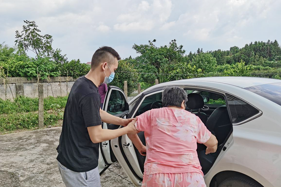 覃孔鑫搀扶行动不便老人上车去卫生院接种疫苗