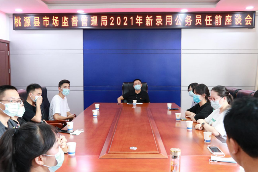 8月17日,桃源县市场监督管理局召开2021年度新录用公务员集中谈话会议。局党组书记、局长程斌辉同志出席会议并讲话。各分管负责人和9名新录用公务员参加会议。