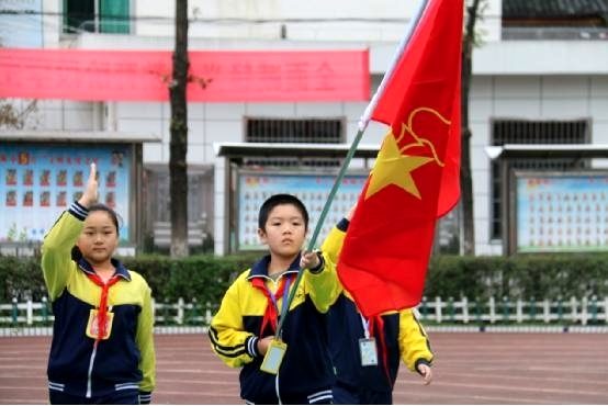 入队仪式由大队长袁欣妍同学主持,在嘹亮的《中国少年先锋队队歌》之后,首先由大队辅导员佘主任宣布了新建中队名单和新队员入队名单。高年级的老队员为一年级同学们佩戴了鲜艳的红领巾。在大队长的带领下,队员们进行了庄严地宣誓,声音响彻在校园上空。本次有233名同学在全校师生的见证下成为一名光荣的少先队员。