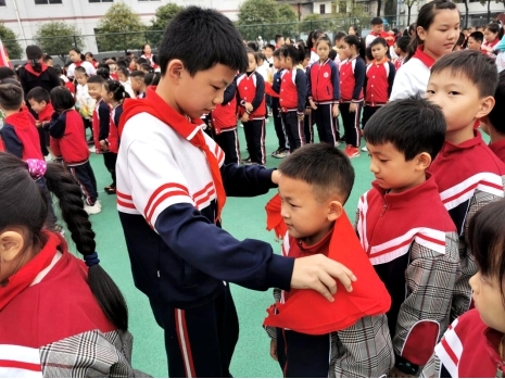 伴着雄壮有力的出旗曲,旗手和护旗手目光坚定迈着整齐的步伐进入会场。大队辅导员杨央庄重地宣读了2021年新入队队员名单。五年级的老队员为新队员佩戴鲜艳的红领巾,党员教师为新队员佩戴队徽。新老之间的这场互动,是一种荣耀的传递,更是一份责任的嘱托。