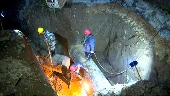 施工现场,多部门相互配合,各班组分工负责,大型机械开足马力,一片忙碌的景象。在几个不同的施工点,工作人员各司其职,各负其责,按照施工规划全力做好各自施工任务。他们有的开着挖掘机吊运管件,有的开着抽水机进行抽水,有的拿着焊枪进行焊接,有的拿着工具准备对接......