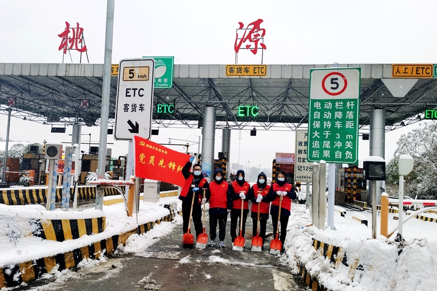 面对雪情,桃源中心站人员迅速集结、分工明确,成立党员先锋队,有条不紊地进行着除雪保畅工作。各班组成员积极行动,行政人员对车道、安全岛、控制柜、计重称台、车牌抓拍器等现场设施逐一清除积雪,保证收费现场正常运行。同时,后勤人员打扫院内积雪,为办公楼、宿舍楼、食堂等过道铺设防滑垫等。