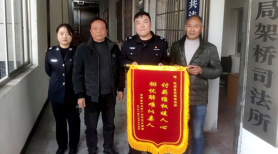 “感谢架桥司法所倾力帮助我们维权,解决了困扰我们许久的难题,拿到钱后今年可以过个好年了。”近日,一群农民工将一面印有“讨薪维权暖人心 排忧解难似亲人”的锦旗送到了桃源县架桥司法所,并连声表示感谢。