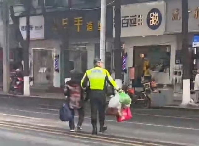 1月1日,常德市桃源县公安交警大队辅警高瑛在漳江中路执勤时,看到车流中一位步履缓慢的老人提着大包小包正在过马路,此时道路上车流量很大,老人在车流中非常危险。高瑛马上上前一手搀扶住老人,另一只手接过老人手里的物品,小心翼翼的扶老人过马路。