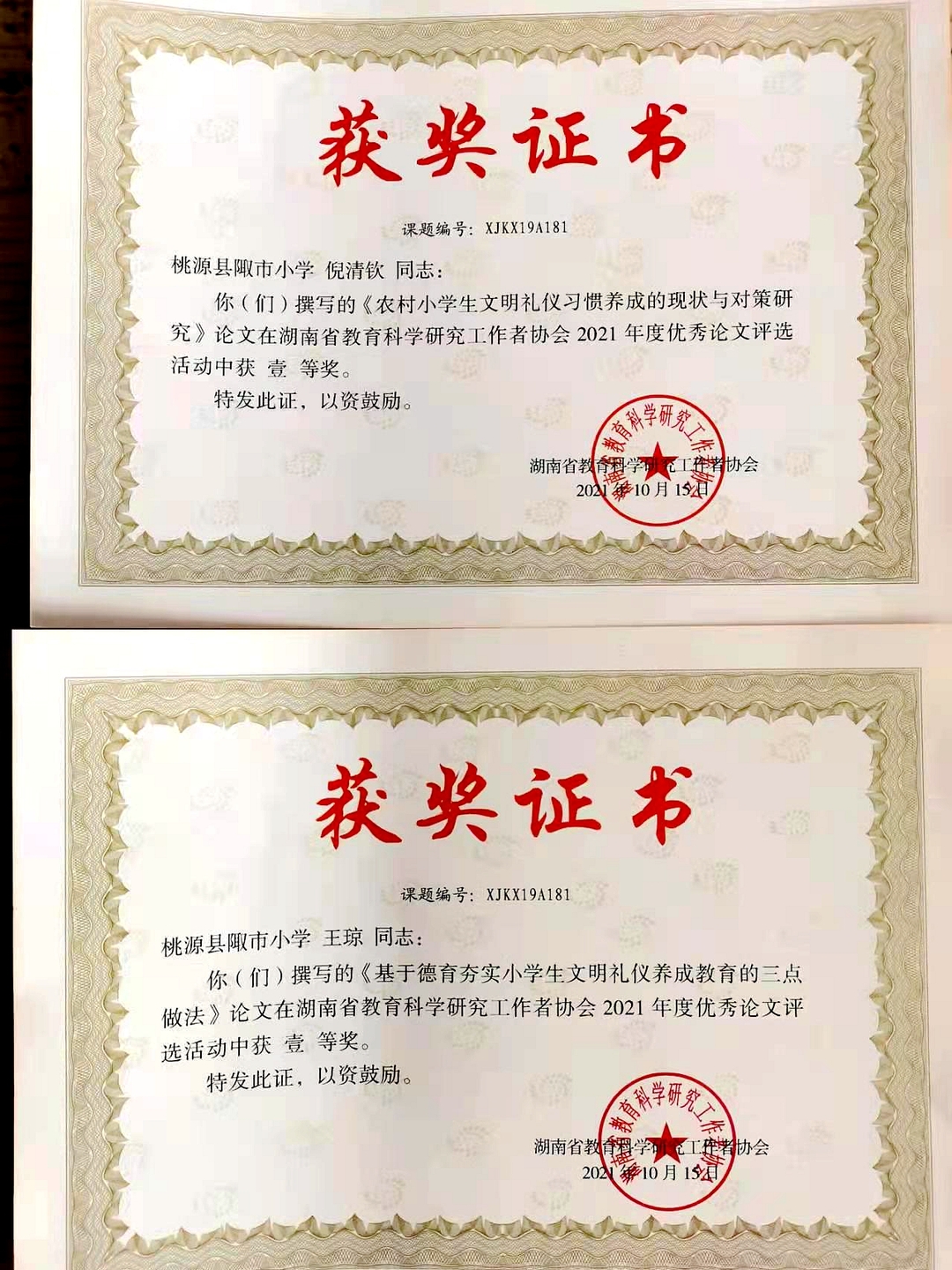 “农村小学生文明礼仪养成教育的研究”是湖南省基础教育重点课题。这一课题旨在通过认真系统地学习文明礼仪知识,开展文明礼仪养成教育活动,帮助农村小学生改掉习惯中的陋习,提高教师和学生的文明礼仪水平,提升学生的综合素质。自2019年12月该课题申报成功以来,陬市小学课题组成员在课题主持人莫碧仙的带领下,边研究,边实践,边思考,积极撰写论文,2020年共14篇论文获奖,2021年再创佳绩,又有18篇论文获奖,其中倪清钦、王琼老师所撰写的论文获省一等奖,张彩霞、文乔、康璇子等老师所撰写的论文获省二等奖,游雅麟、张圣兰、徐桂丽等老师所撰写的论文获省三等奖。
