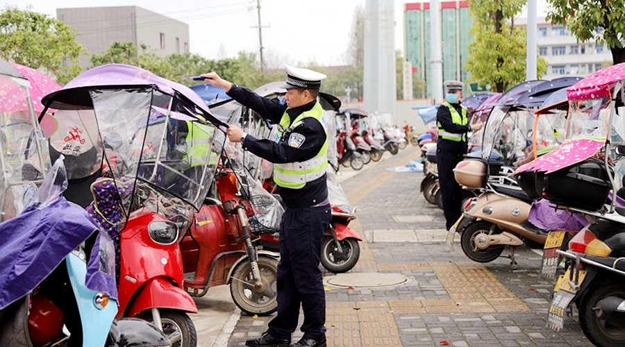 17日,在大队统一部署下,大队漳江中队民辅警在中队长郭勇进的带领下,来到漳江工业园湖南嘉泰鞋业有限公司,在企业的配合下,对摩托车、电动车非法加装伞棚、不戴安全头盔等交通顽瘴痼疾进行强力整治。针对加装伞棚的违法行为,交警对其进行现场拆除切割处理,对不佩戴安全头盔的违法行为,进行宣传教育。经统计,当日在嘉泰鞋业公司共切割拆除伞棚500余把,教育驾驶人13人,收到了良好整治效果。