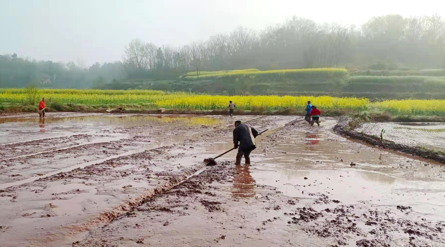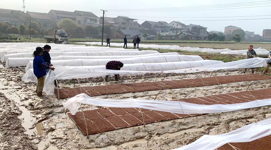 “趁着天气回暖,有利于早稻的播种,我们要争取早点抢播下去。”村干部们正在田间地头里和农户们忙着平地、撒种、搭棚、盖膜,现场一片繁忙。