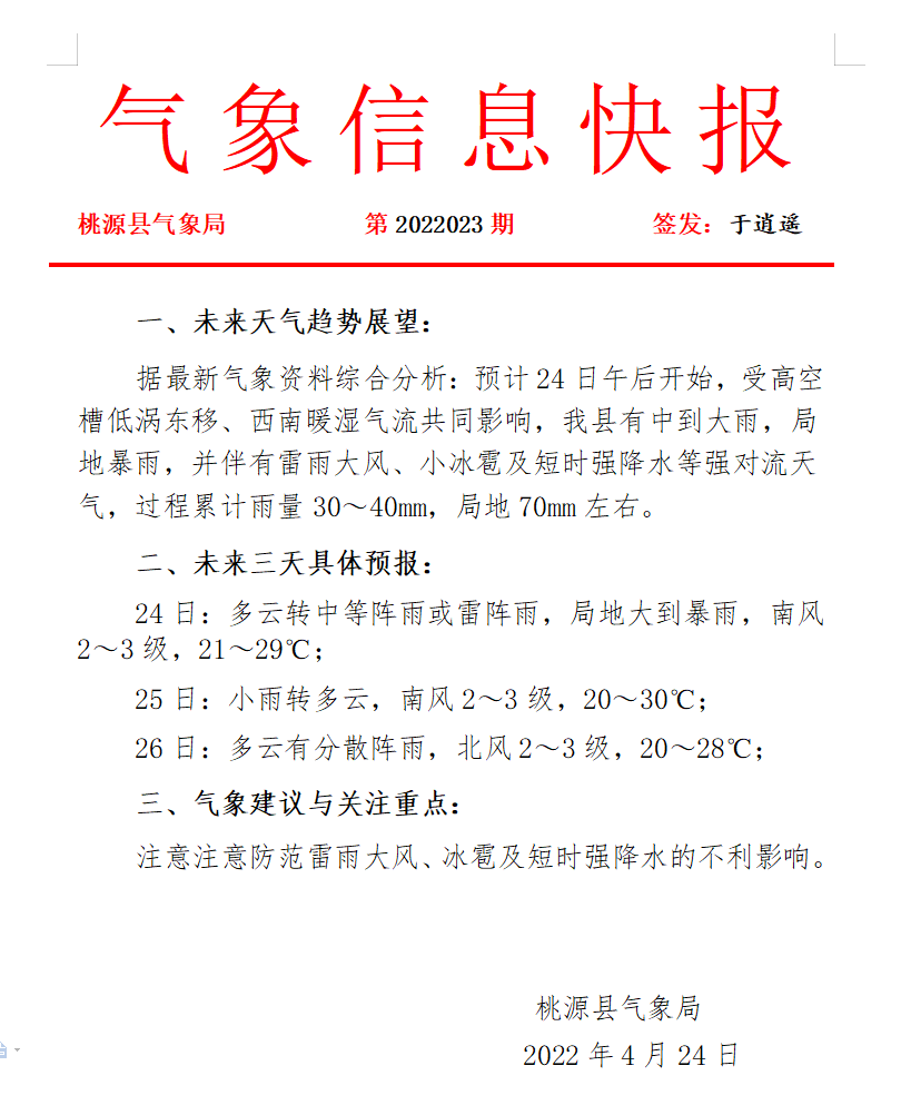 据最新气象资料综合分析:预计24日午后开始,受高空槽低涡东移、西南暖湿气流共同影响,我县有中到大雨,局地暴雨,并伴有雷雨大风、小冰雹及短时强降水等强对流天气,过程累计雨量30~40mm,局地70mm左右。