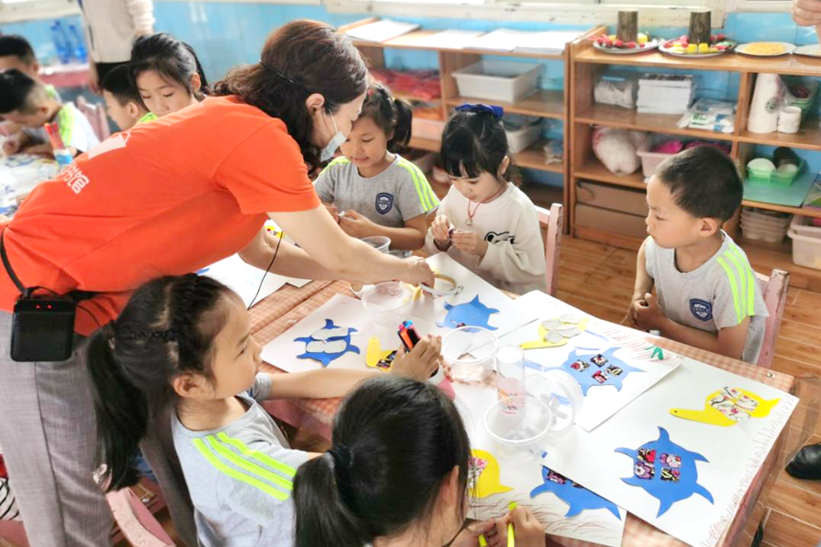 在漆河仙鹤幼儿园,布偶剧表演后,乡镇妇联工作人员与小朋友们一起制作了乌龟与大海的布艺拼贴画,小朋友们纷纷表示以后也要像小乌龟壳壳一样,勇敢去实现自己梦想。