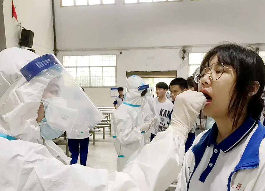 “请所有高三师生和参与高考工作的相关人员于上午10点赶到学校一食堂做核酸检测。请后勤科各部门督促本部门临聘人员做核酸检测。”6月5日上午10点,通知一出,桃源县第二中学全体高三师生和参与高考的工作人员井然有序地来到指定地点接受核酸采样。