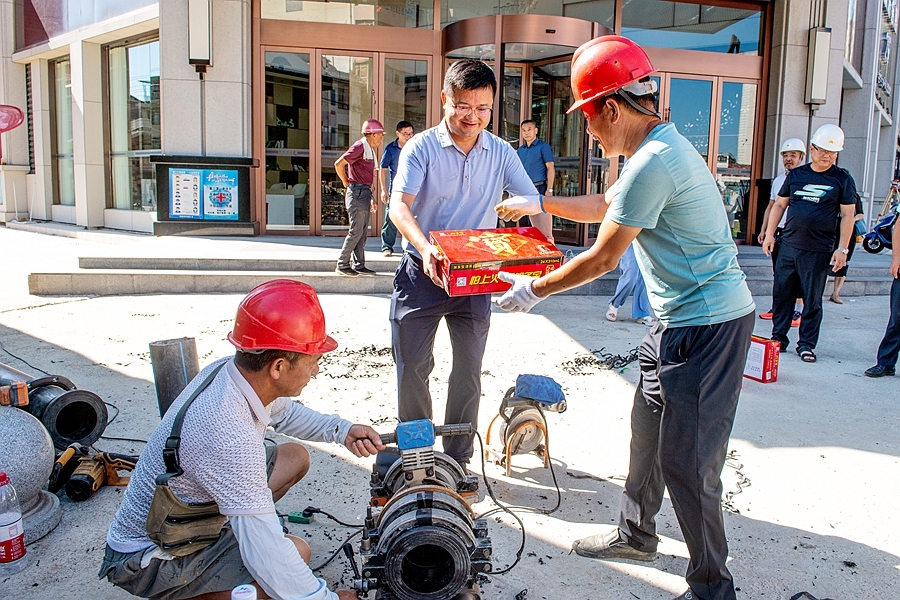 连日来持续高温,为保证城区正常用水用气、城区市政建设按时进行,市政职工们在一直高温下作业。7月13日,县市政建设服务中心组织了夏日“送清凉 下一线”慰问活动,到施工现场看望慰问烈日下坚守岗位的工作人员。