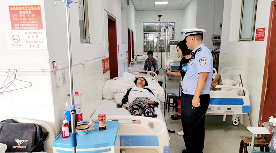 当日上午,三阳交警中队民辅警在中队长李太杰的带领下,冒着39度的高温在省道311线三阳港镇粮库路段,开展夏季“百日行动”,严查各类交通违法。10时10分许,一位行经此地的老年妇女忽然晕倒在地,见此情况,民警立即跑过去查看情况,老人已呈昏迷状态,问围观群众也不认识倒地老人。在此情况下,民警顾不得多想,立即把老人抬上警车,辅警周建军开车把老人送到三阳港镇中心医院急救,并为老人办好了一切住院手续。经救治,老人慢慢清醒能说话了。