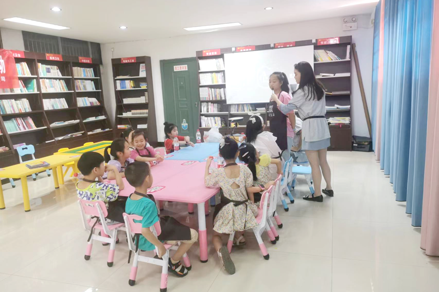 “您好,欢迎光临!”、“您好,需要什么书籍?”、“您好,一共38.5元,欢迎下次再来”,小店长们身着特制围裙,在工作人员的带领下,经过前期培训后迅速上岗,大家协同合作,有的在收银结算、有的在打包分类、有的在为读者推荐、有的在给图书造型,认真工作的模样就像一道美丽的风景。