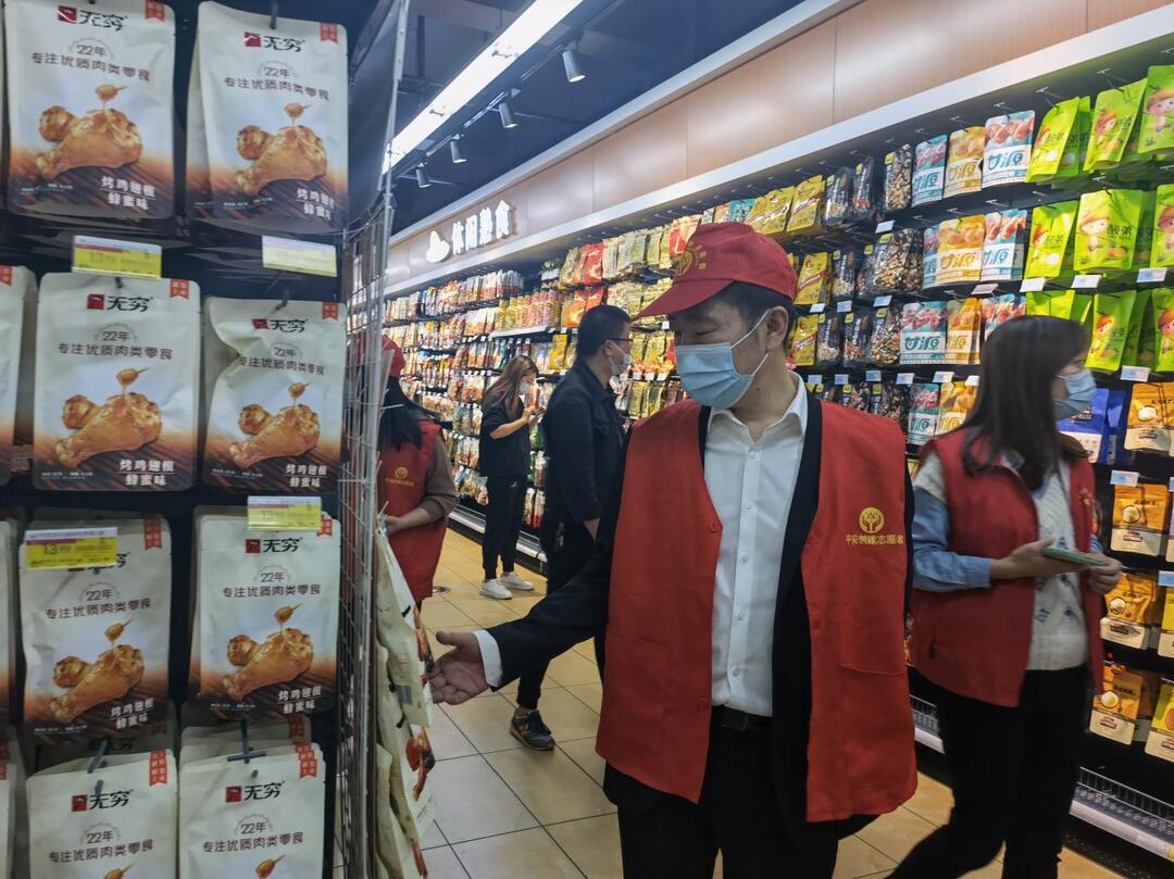 志愿者检查超市食品安全现场