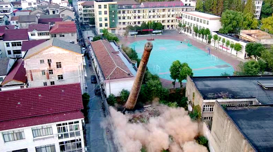 11月2日下午5时20分,随着“轰”的一声低闷爆响,位于桃源县城原桃源师范学校校园内的一座废弃烟囱,朝着指定方向倒下。