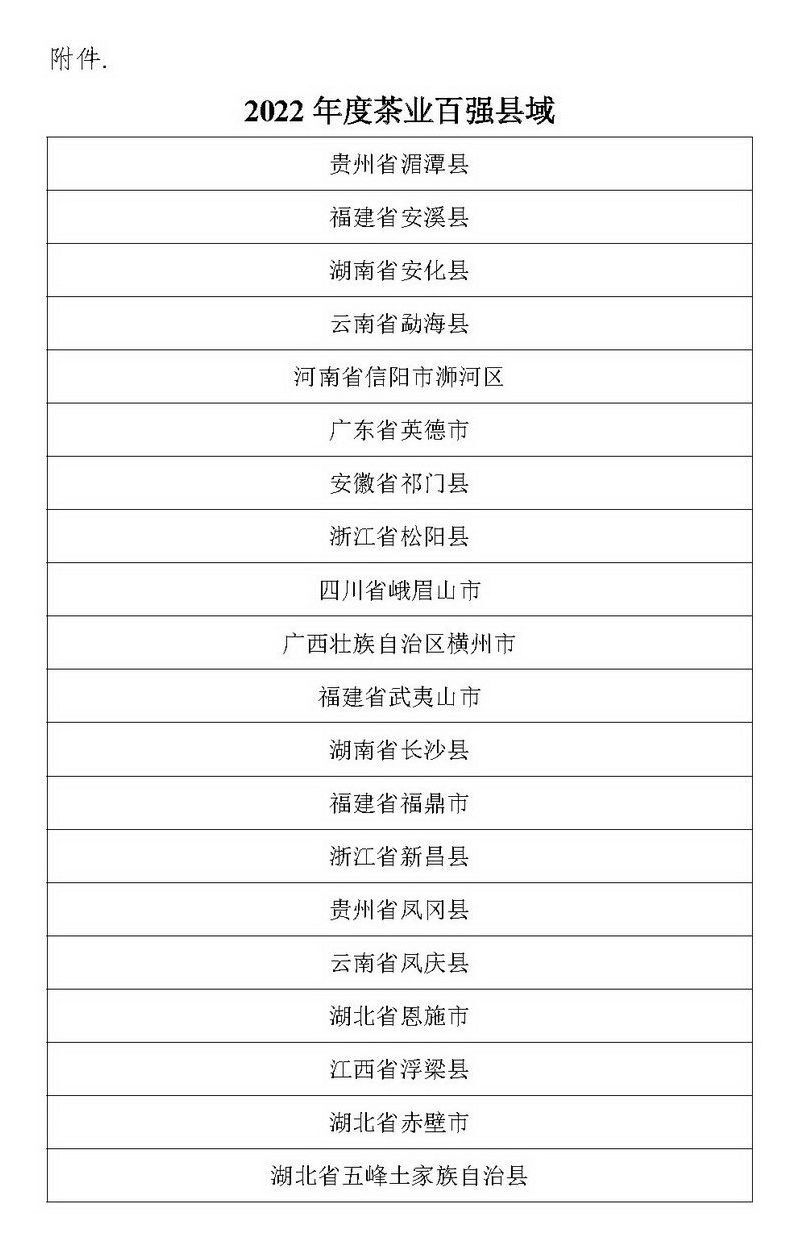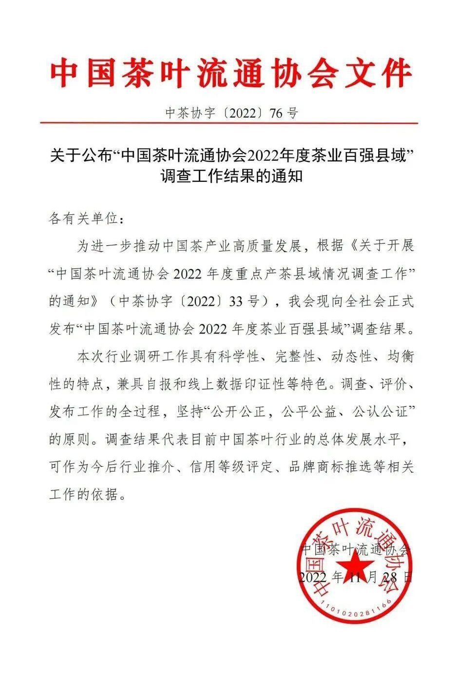 11月28日,中国茶叶流通协会发布《关于公布“中国茶叶流通协会2022年度茶业百强县域”调查工作结果的通知》,我县获评2022年度全国茶业百强县域,名列第29位。