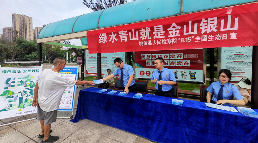 为迎接全国首个生态日的到来,8月14日上午,桃源县人民检察院以“绿水青山就是金山银山” 为主题,在桃源县文体中心广场举办了生态日法治宣传活动。