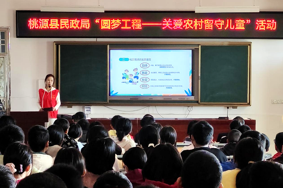 为进一步加强农村留守儿童关爱保护,持续提升留守儿童关爱服务温度,近日,桃源县民政局志愿者在马鬃岭镇中学开展“圆梦工程——关爱农村留守儿童”志愿者服务活动。活动现场,志愿者为全体青少年儿童传授了一期预防校园欺凌和爱国主义教育公开课并发放助学物资。