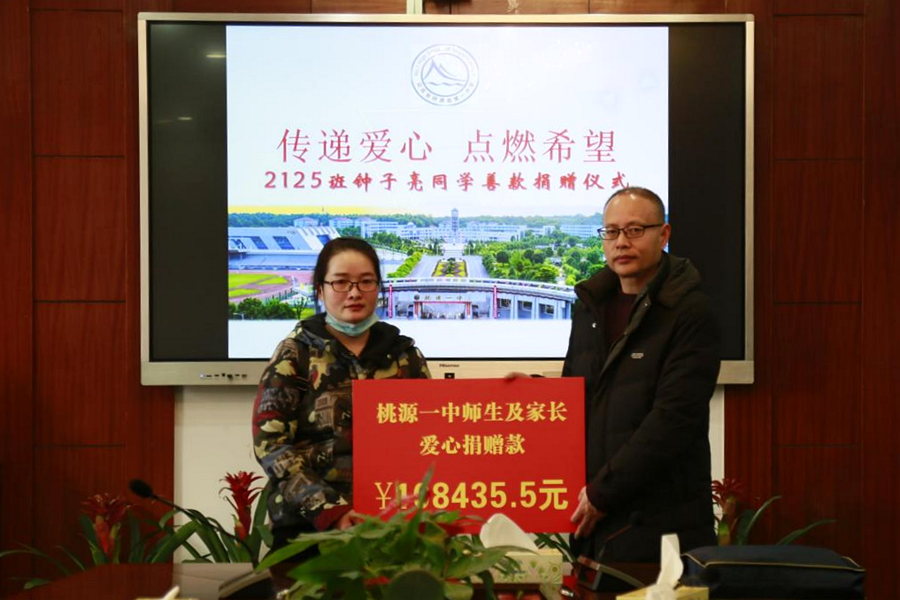 1月11日上午,桃源县第一中学高三年级2125班钟子亮同学的母亲受邀来校,桃源县第一中学党委书记刘宏清将10万余元爱心款交到她手中,用于孩子的病情治疗,并和她进行交流,希望钟子亮同学能早日养好身体。接过爱心款的钟母湿了眼眶,向学校表达了衷心的感谢。