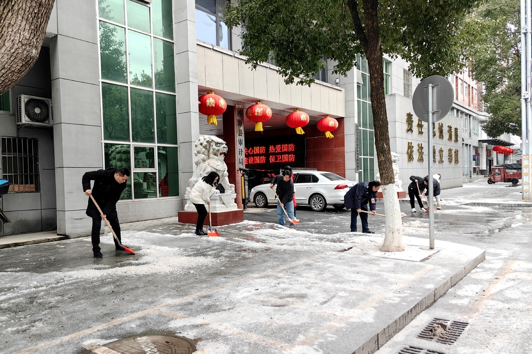 2月22日,桃源迎来了第二场雪,银装素裹,积雪结冰覆盖住道路,审计局全体干部以雪为令齐行动,在包保路段和单位门前院落开展铲雪除冰工作。