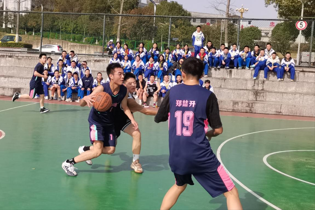场上,运动员们尽情挥洒汗水,奋勇争先,展现了团结、拼搏、进取的精神。每一次巧妙抢夺、突破,每一次篮球入网都赢得阵阵掌声;场边,各班啦啦队呐喊助威声此起彼伏。