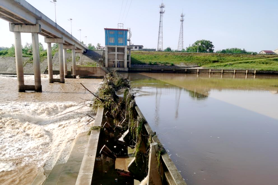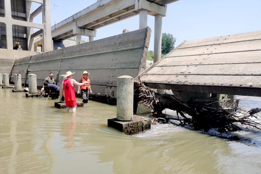 5月8日大暴雨过后,白洋河水轮泵管理站翻板闸区堆积了大量断木杂物,导致闸门无法自动闭合,严重威胁白洋河水厂供水和灌区生产用水。5月14日,待沅江水位稍退,该泵站工作人员瞅准时机,对翻板闸门间的异物进行清理。他们行走于狭窄的闸门工作桥,齐心协力操作4个起重设备对两扇闸门和大树桩进行起重,该设备每个重达两三百斤,需人工从几百米的堤上机房抬运至河道闸门处,使用油锯、砍刀切割堆积的树干,徒手清理卡入闸缝的漂浮物……