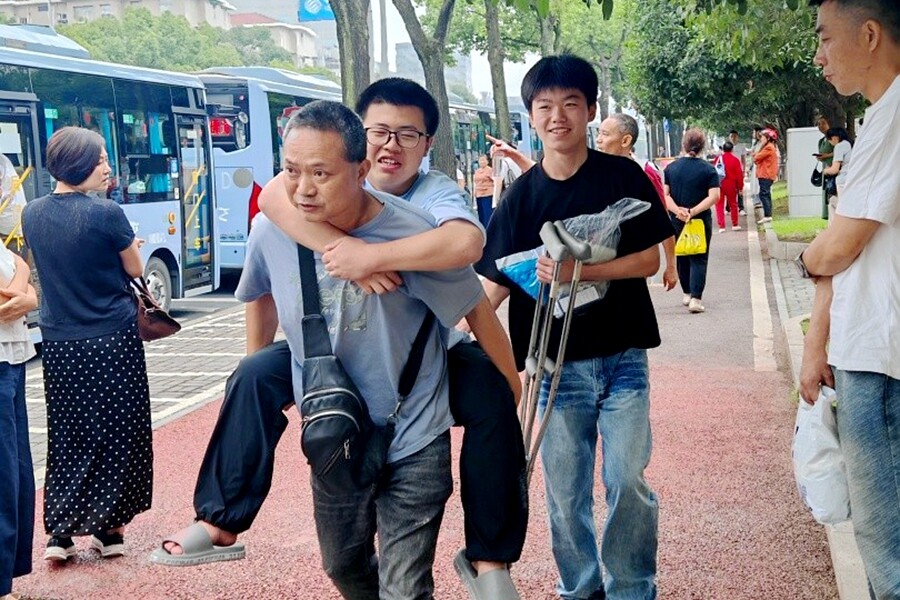 这温暖的一幕迅速感染了周围的同学。有人立即上前搀扶,为老师分担重量;有人主动接过考生的双拐和文具袋;还有女生小跑着到前面开路,“小心台阶”“慢一点”关切的叮嘱此起彼伏,送考大巴上的其他考生也纷纷让出通道,有人甚至拿出湿巾递给满头大汗的邓老师。