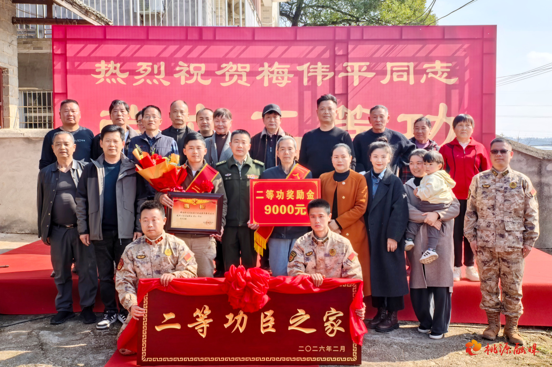 活动现场,工作人员为梅伟平及其家属佩戴绶带、颁发喜报奖励金,并送上“二等功臣之家”牌匾,漳江街道预定新兵易航宇作表态发言,表达了向梅伟平同志学习、投身军营报效国家的坚定决心。周军在讲话中寄语广大青年以梅伟平同志为榜样,踊跃参军报国,营造崇军拥军的浓厚社会氛围。