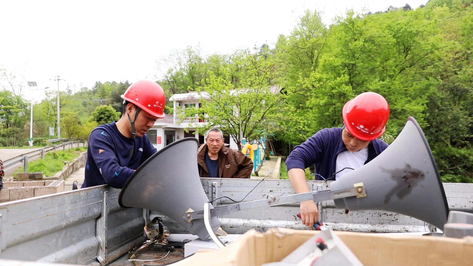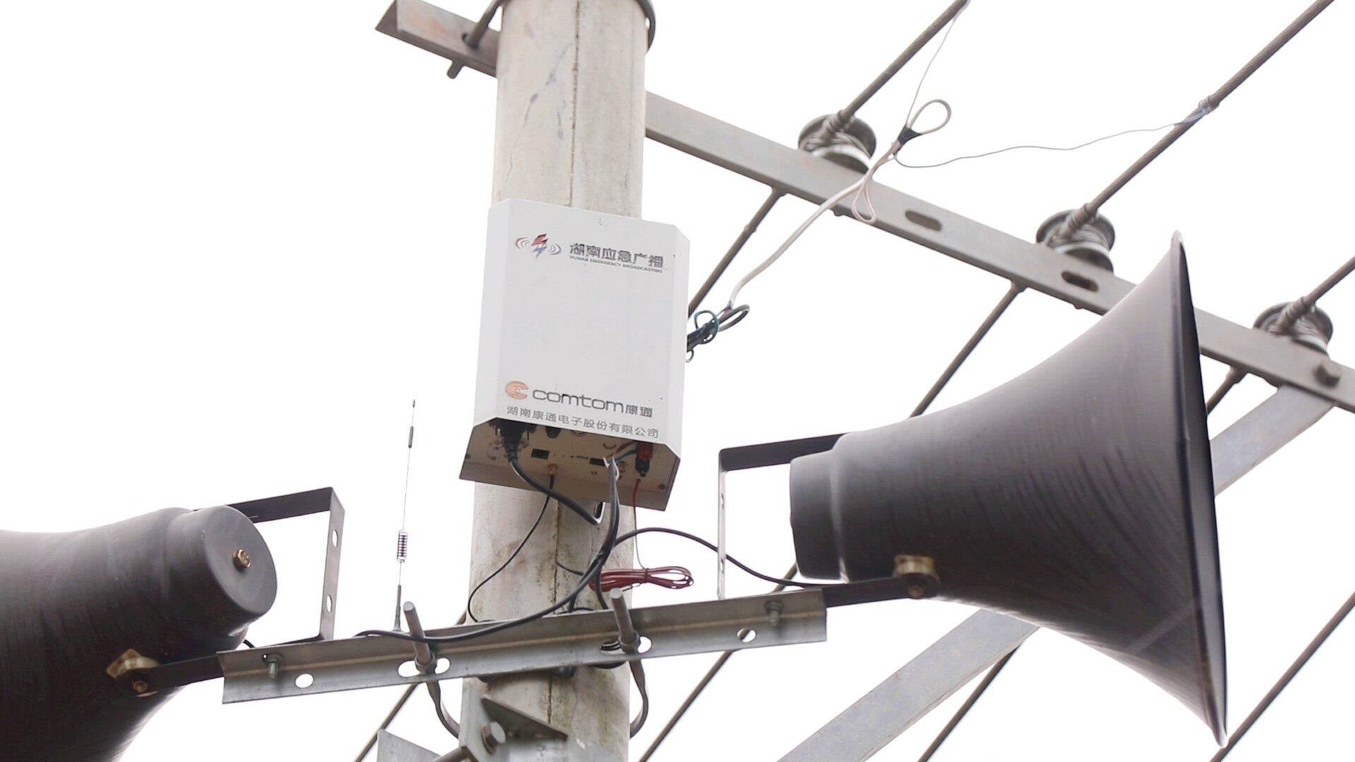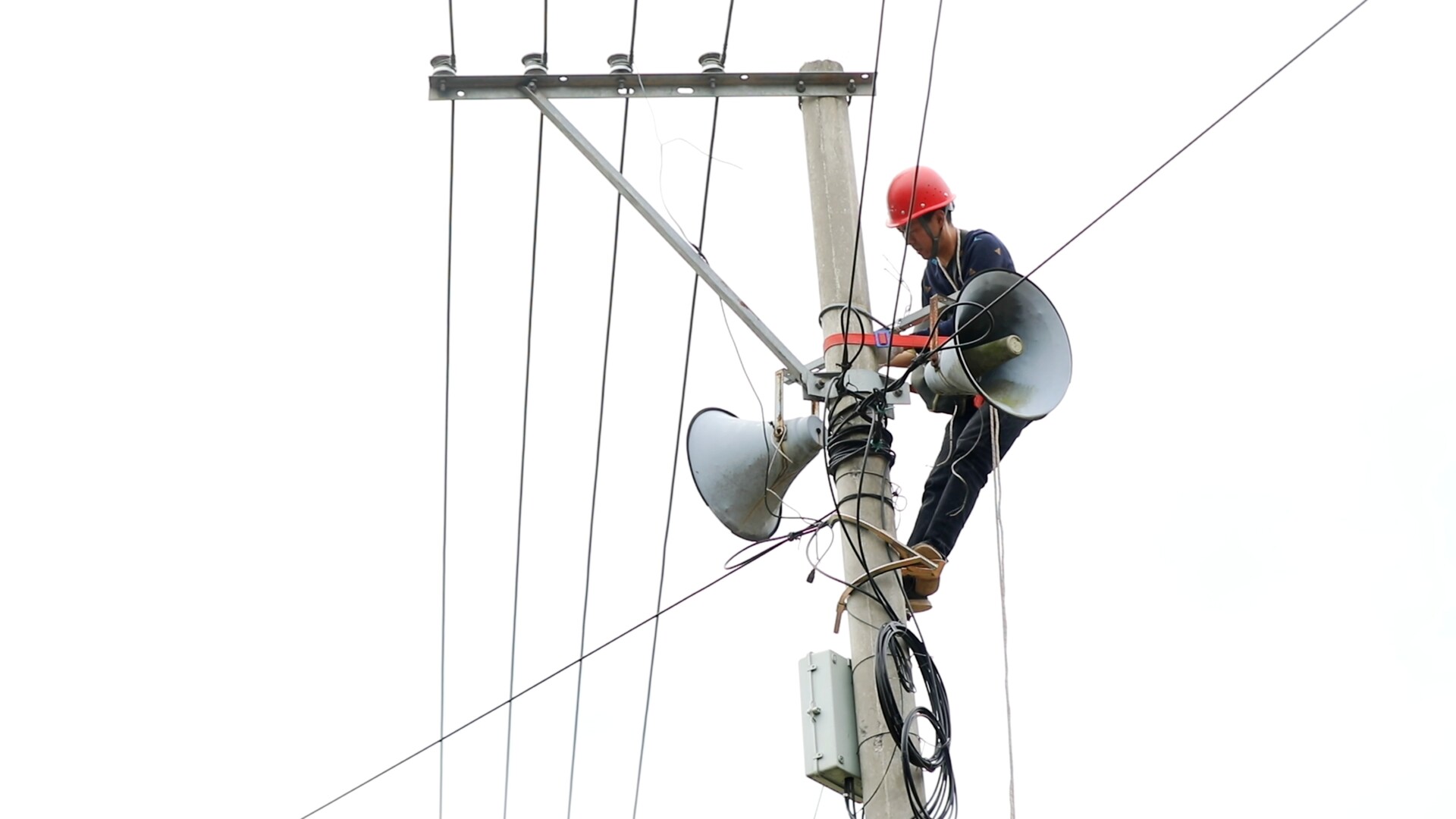 在理公港镇张家山村,专业技术人员正系着安全绳,借助专用设备攀爬到数米高的电线杆上,逐一排查应急广播故障。通过检查喇叭接口、梳理传输线路、更换老化破损导线、重新对接固定接触不良接口后,原本沉默的大喇叭终于恢复运行。