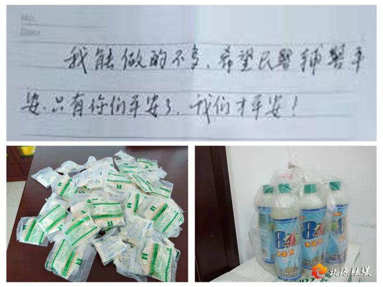 这张纸条是桃源县郑家驿镇某药店老板程女士留下的,她儿子在桃源县公安局巡逻反恐大队工作,听儿子说起民警、辅警在疫情防控一线缺少防护用品后,她立即将药店内仅有的10瓶84消毒液和67副医用手套清点出来,把要说的话写在纸条上,于1月29日下午专程送到公安局,把东西放下就走了。