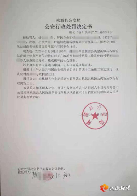 2020年1月31日,阻拦并辱骂疫情防控宣传村干部的姚某,被桃源警方依法执行3日行政拘留的处罚。