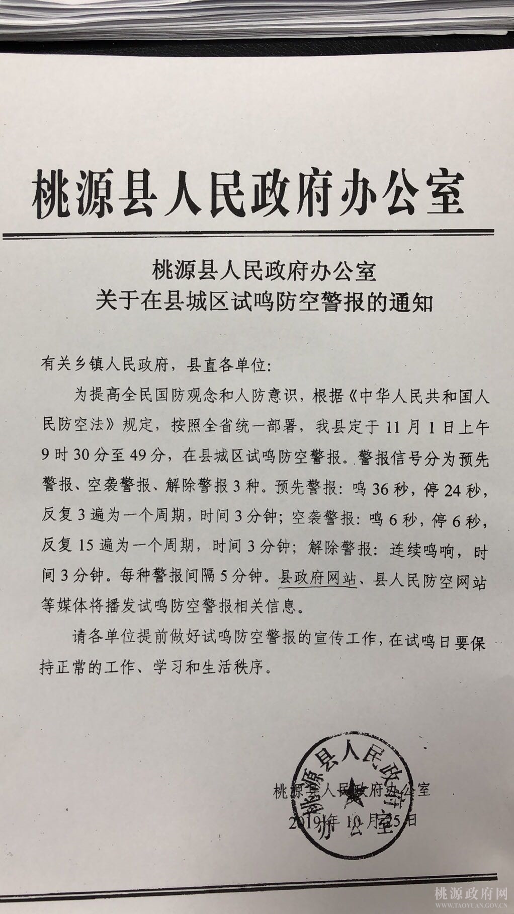 桃源县人民政府办公室关于在县城区试鸣防空警报的通知