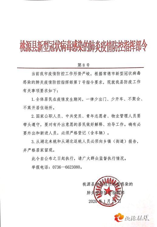 桃源县新型冠状病毒感染的肺炎疫情防控指挥部令(第8号)