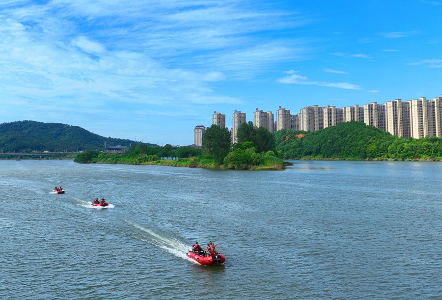 洣水河衡东县城区段,应急救援队队员在进行水上救援训练。