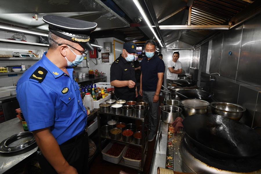 长沙市开福区四方商贸城夜市街区,执法人员在检查餐饮门店的燃气安全。