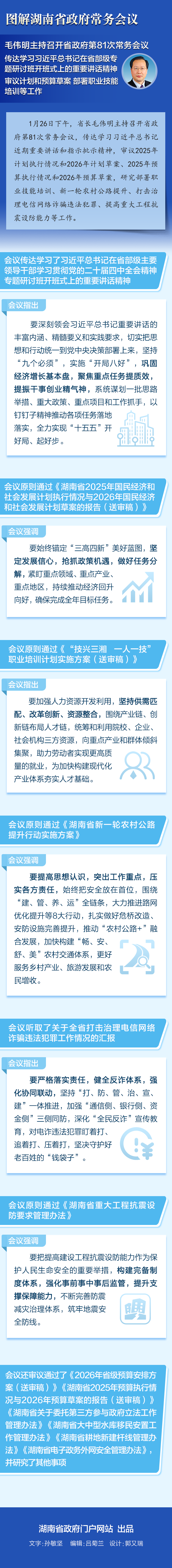 【图解】1月26日省政府常务会议:传达学习习近平总书记在省部级专题研讨班开班式上的重要讲话精神等 来源:湖南省人民政府门户网站 发布时间:2026-01-27 11:18 【字体:小 大】 扫一扫在手机打开当前页 分享到: 【打印正文】