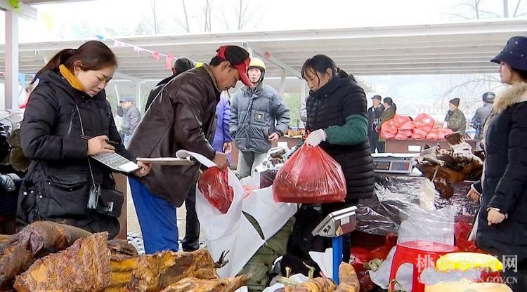 桃源县汤家溪农产品专业合作社负责人张万雄:“从今天总体销量来看,手工粉销了200多份,1000多斤红薯粉的销量;手工糍粑销了100多份,总共是2000多个;腊肉销了大概几百斤,做到产了有地方销。”