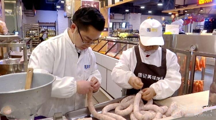 其中一对夫妻一大早就来到超市,选购了7斤肥瘦相宜的猪肉,一会儿工夫,就在这里加工成了一串灌肠,这是他们特地为子女们准备的“年味儿”。