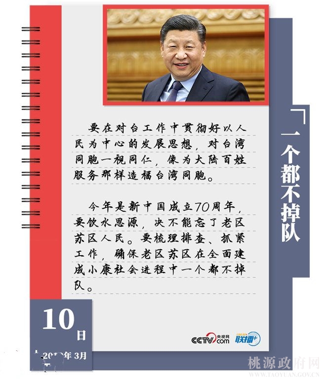 3月10日下午,习近平总书记参加十三届全国人大二次会议福建代表团审议时强调,“要饮水思源,决不能忘了老区苏区人民”,“要在对台工作中贯彻好以人民为中心的发展思想,对台湾同胞一视同仁,像为大陆百姓服务那样造福台湾同胞”。