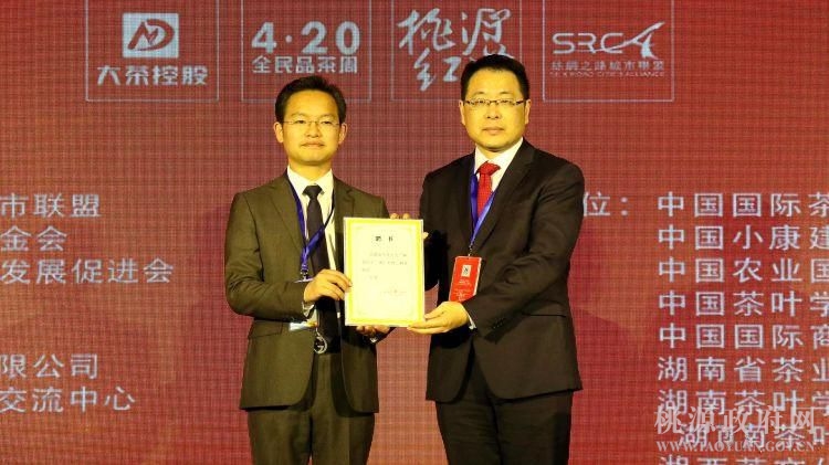 中共桃源县委副书记陈德为苏大宝先生颁发了“桃源红茶”推广大使聘书。