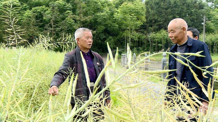 油菜种植户向优昌:“这个花开到哪里角果就结到哪里,一直结上顶,没有一点空壳;第二个是三次药打好了这个菌核病基本没有。”