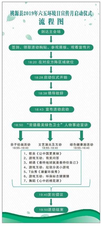 6月3日,在双洲公园将举行桃源县2019年六五环境日宣传月启动仪式活动,包括环保主题展、文艺表演、节目互动、亲子绘画活动、绿色健康跑活动等多种形式,倡导全社会积极参与环保事业,行动起来共保母亲河沅江,同建美丽新桃源。