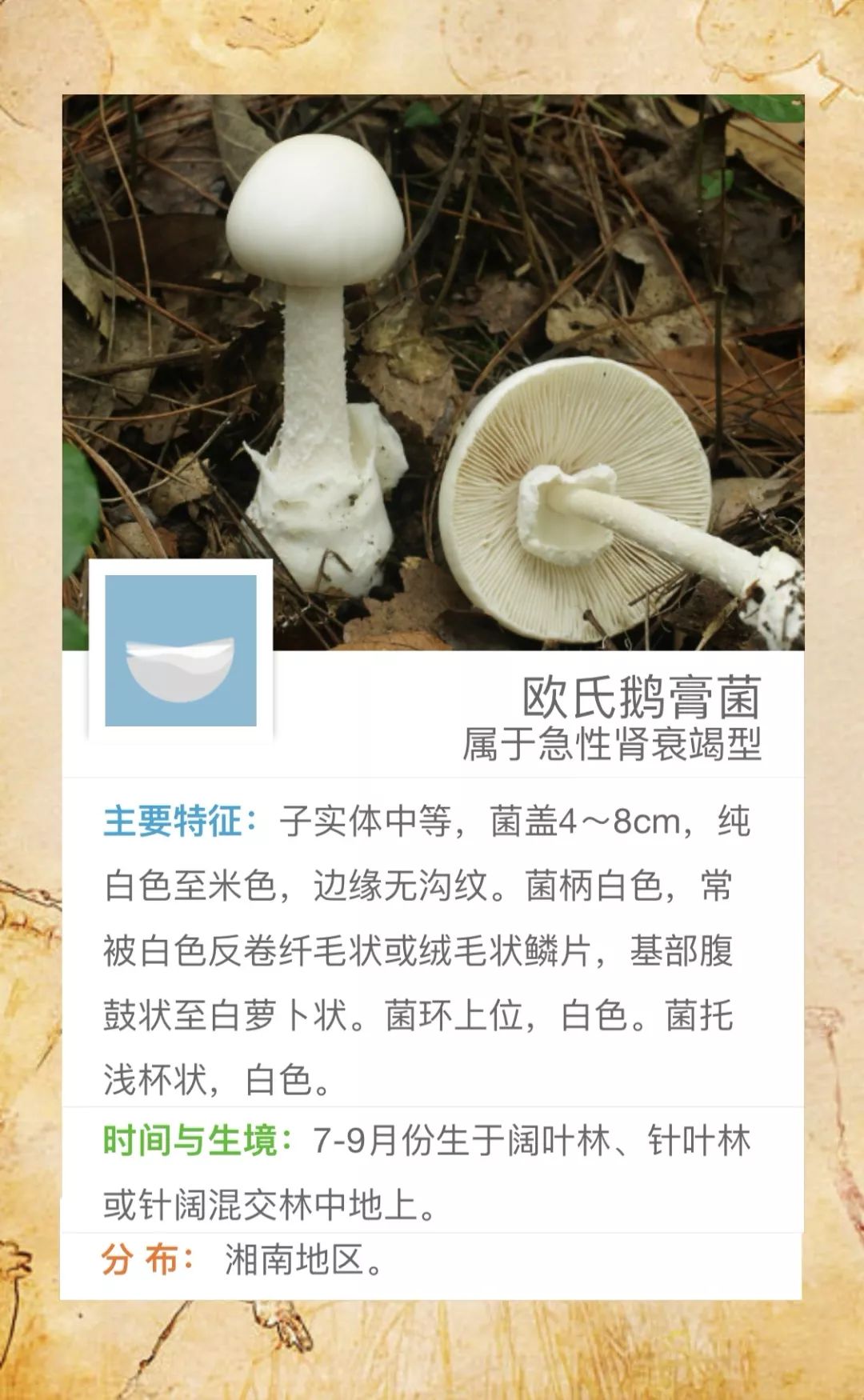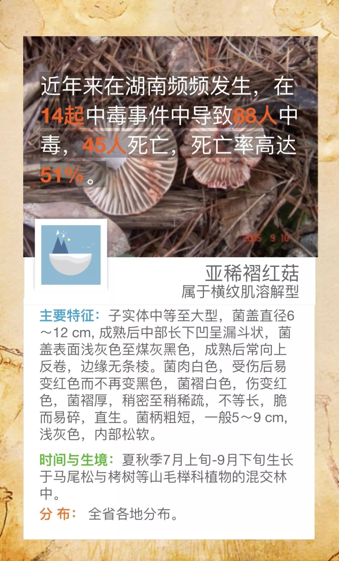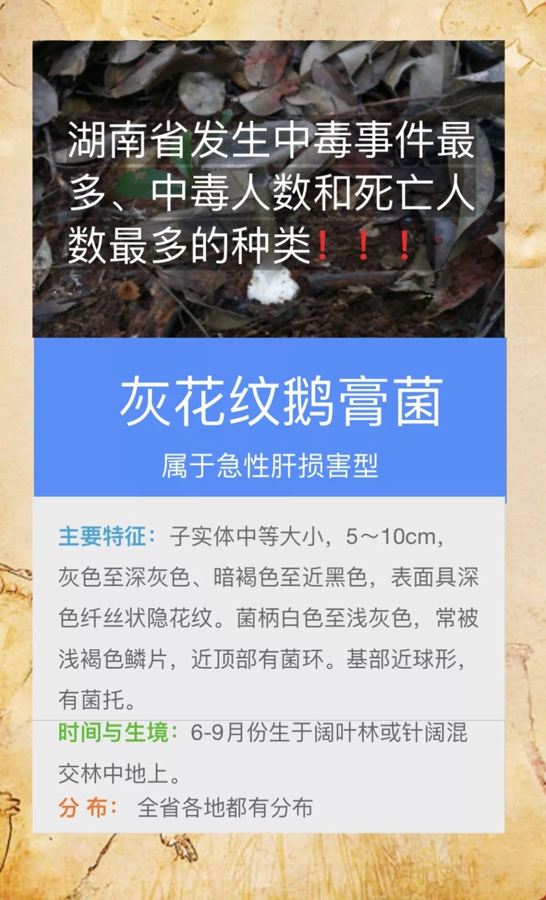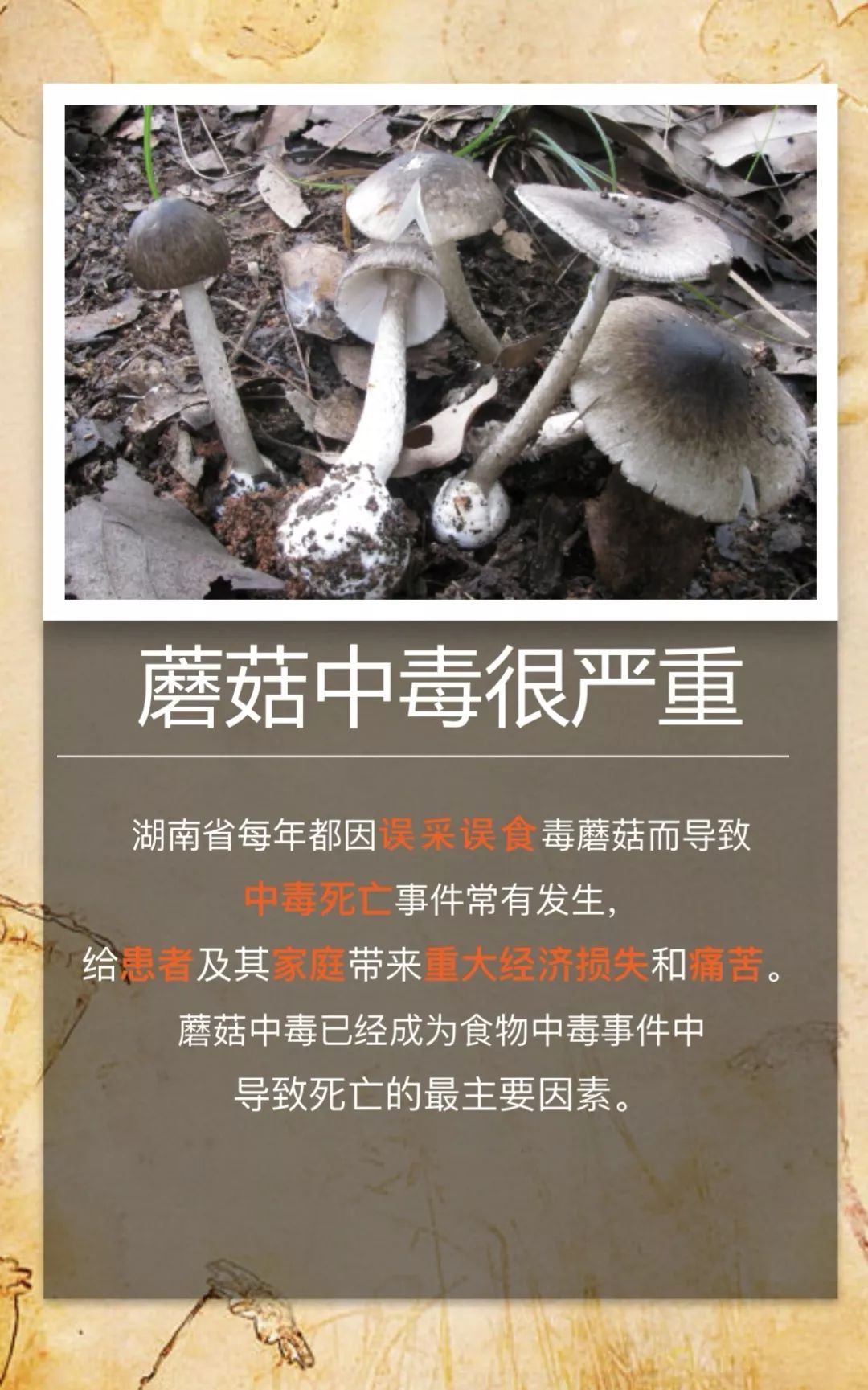 @桃源人,湖南常见毒蘑菇有哪些?怎么识别? 来源: 发布时间:2019-07-16 09:29 【字体:小 大】 我省每年因误采食毒蘑菇而导致的中毒死亡事件常有发生,给患者及其家属带来巨大的痛苦和沉重的经济负担。毒蘑菇中毒已经成为食物中毒事件中导致死亡的最主要因素!国家食品安全风险监测湖南中心的专家提醒市民:千万不要随意采摘、食用野生蘑菇!此外,民间流传的识别毒蘑菇的方法,如银针验毒、大蒜去毒等方法并不可靠,切勿相信。一旦食用野生蘑菇后出现中毒症状,应立即催吐,尽快就医。那么,我省常见的毒蘑菇有哪些呢?一起来涨涨姿势吧! 扫一扫在手机打开当前页 分享到: 【打印正文】