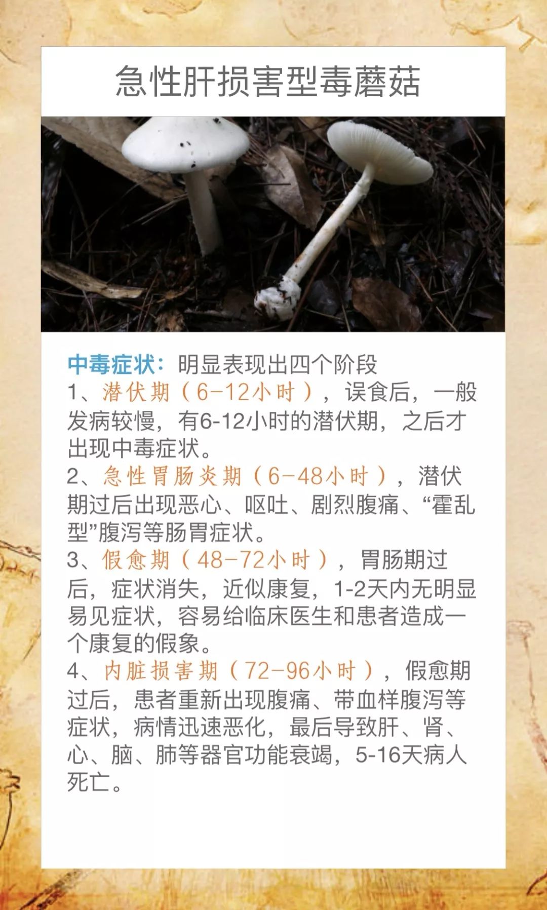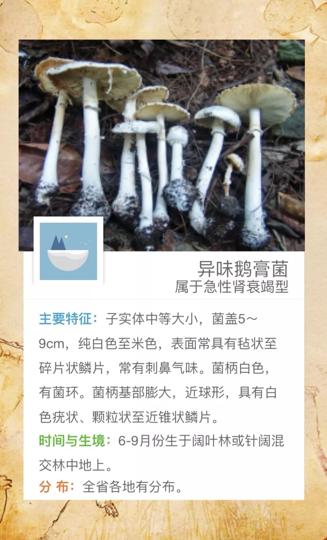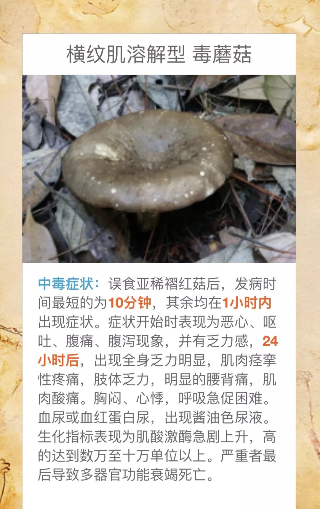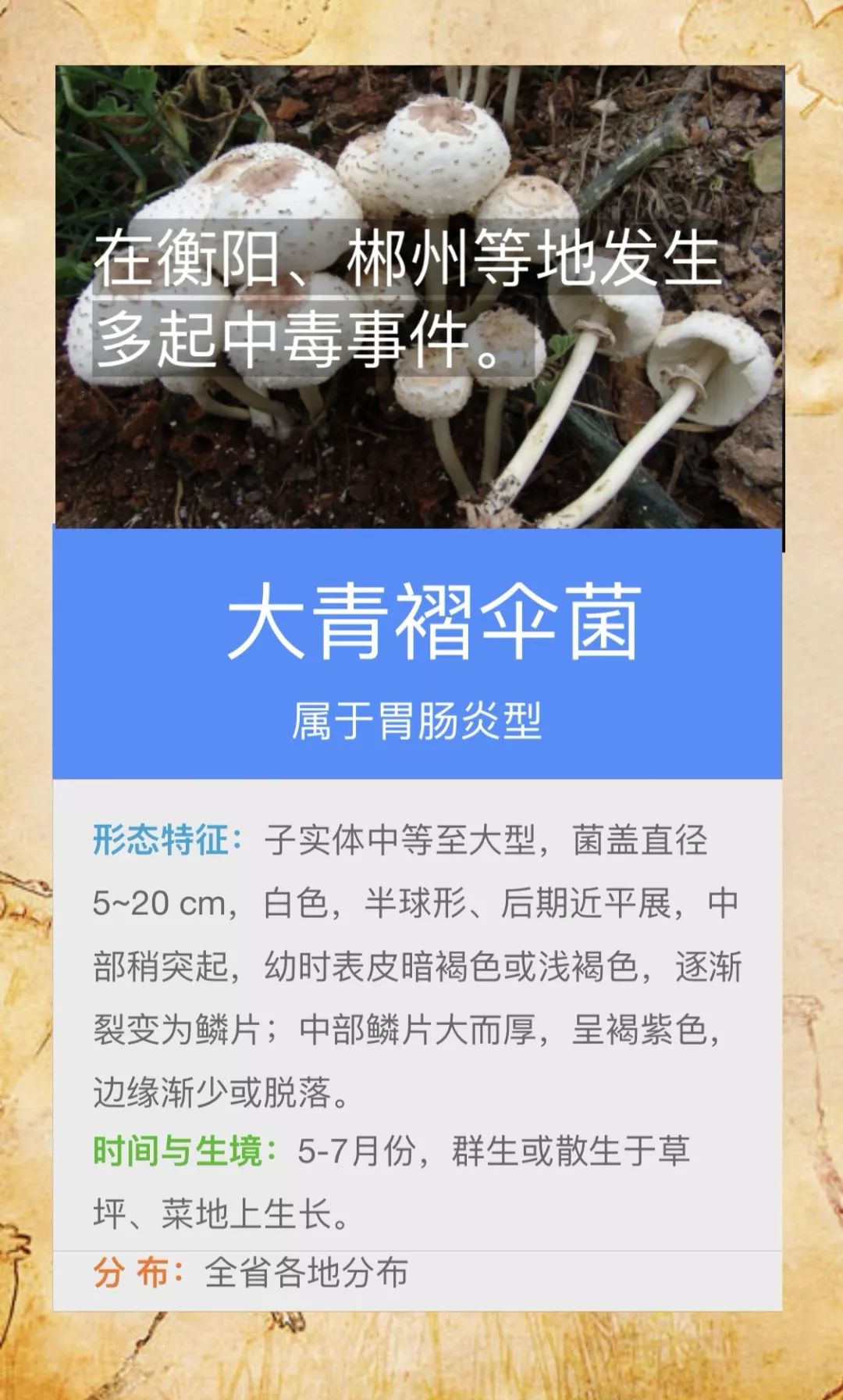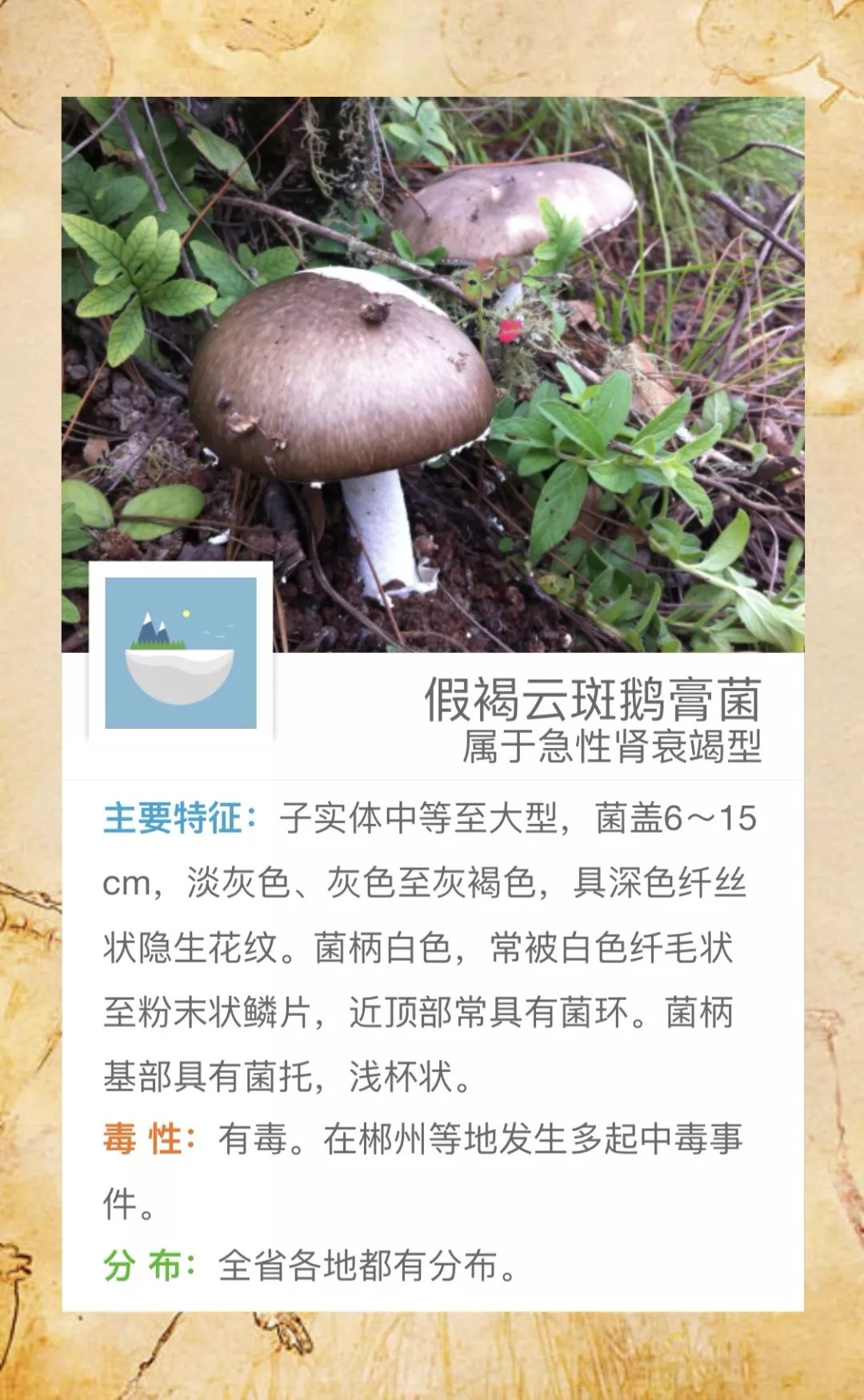@桃源人,湖南常见毒蘑菇有哪些?怎么识别? 来源: 发布时间:2019-07-16 09:29 【字体:小 大】 我省每年因误采食毒蘑菇而导致的中毒死亡事件常有发生,给患者及其家属带来巨大的痛苦和沉重的经济负担。毒蘑菇中毒已经成为食物中毒事件中导致死亡的最主要因素!国家食品安全风险监测湖南中心的专家提醒市民:千万不要随意采摘、食用野生蘑菇!此外,民间流传的识别毒蘑菇的方法,如银针验毒、大蒜去毒等方法并不可靠,切勿相信。一旦食用野生蘑菇后出现中毒症状,应立即催吐,尽快就医。那么,我省常见的毒蘑菇有哪些呢?一起来涨涨姿势吧! 扫一扫在手机打开当前页 分享到: 【打印正文】