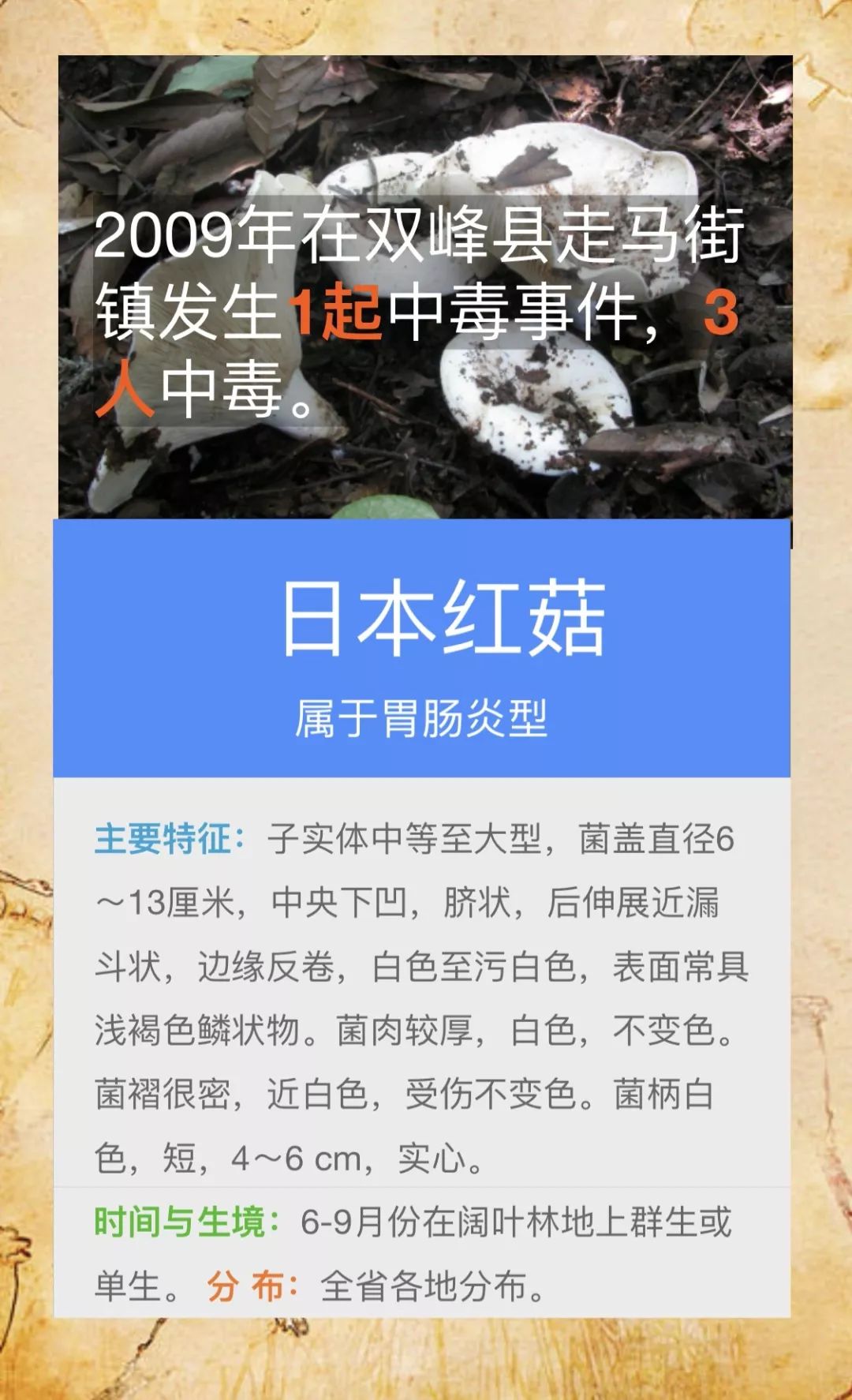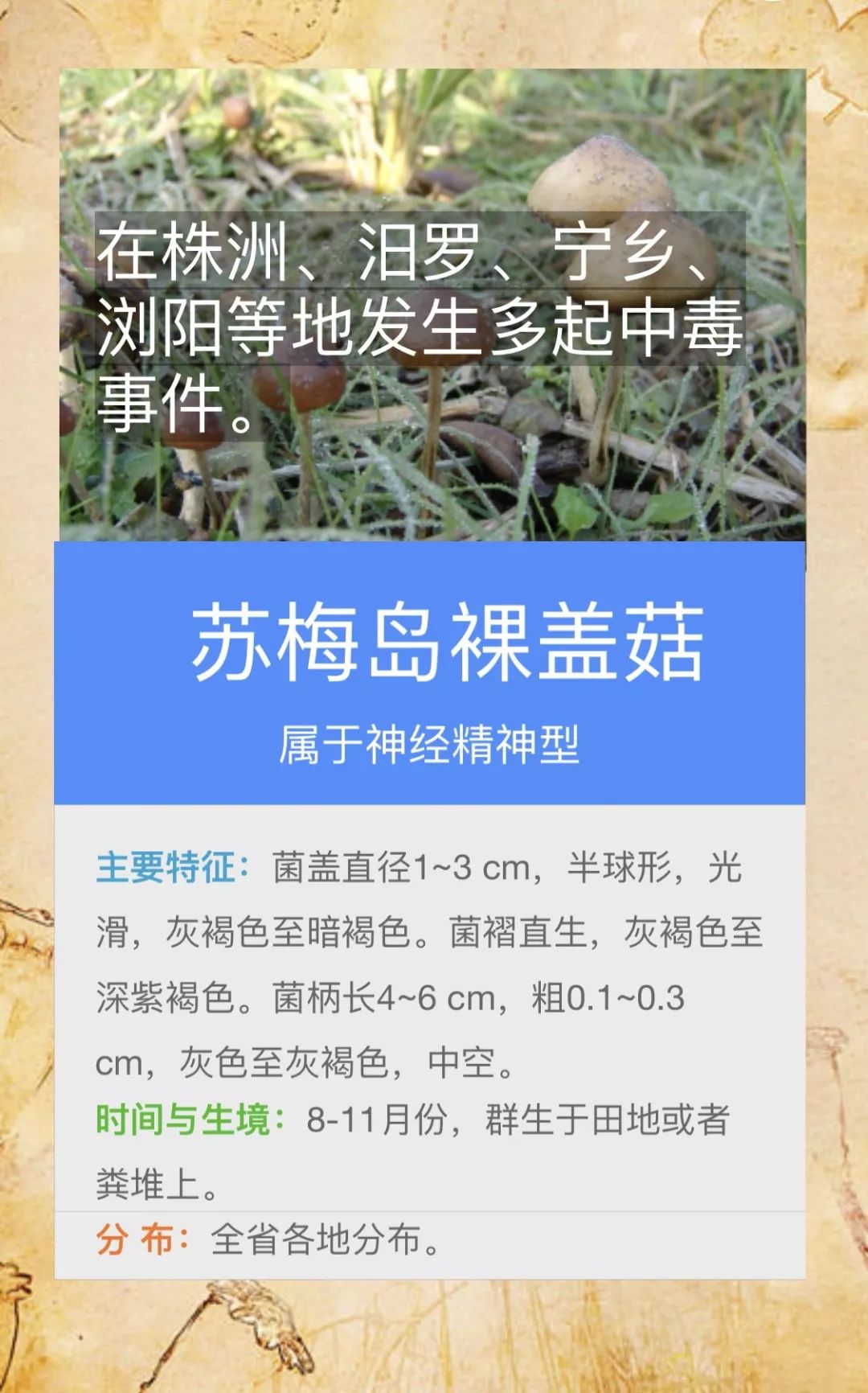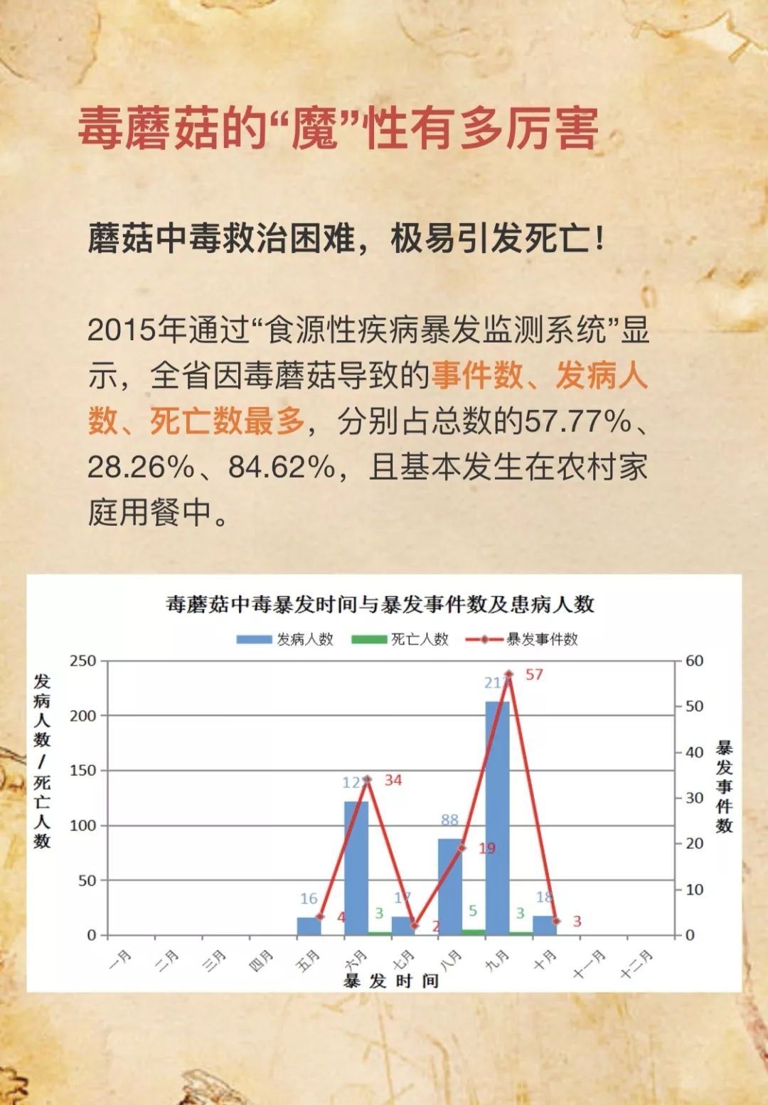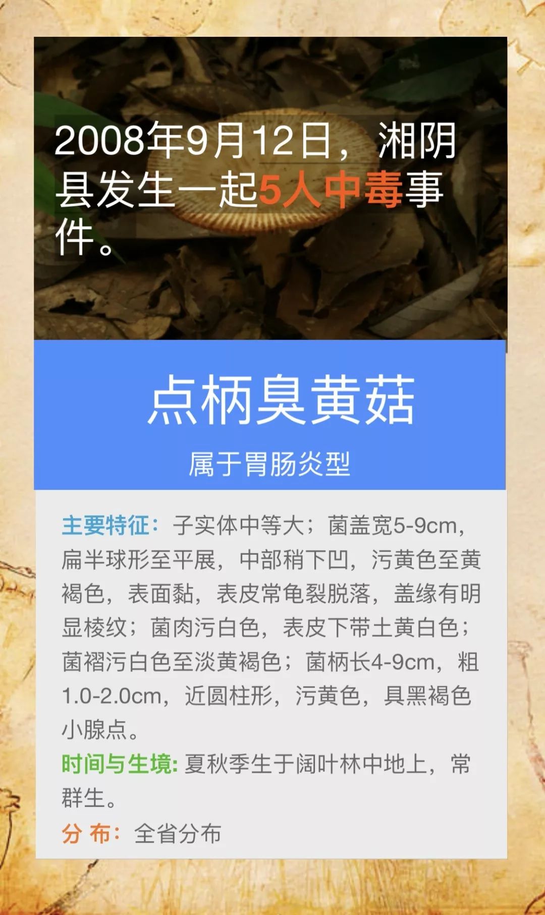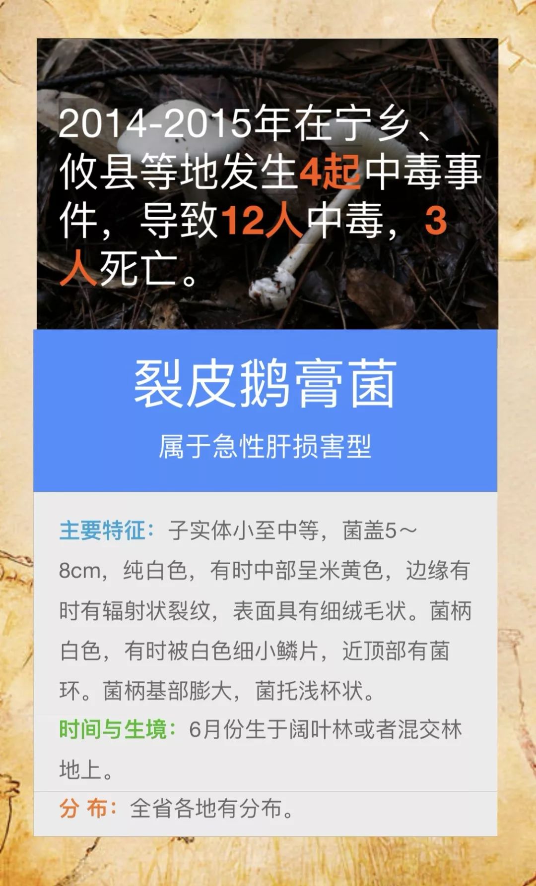 @桃源人,湖南常见毒蘑菇有哪些?怎么识别? 来源: 发布时间:2019-07-16 09:29 【字体:小 大】 我省每年因误采食毒蘑菇而导致的中毒死亡事件常有发生,给患者及其家属带来巨大的痛苦和沉重的经济负担。毒蘑菇中毒已经成为食物中毒事件中导致死亡的最主要因素!国家食品安全风险监测湖南中心的专家提醒市民:千万不要随意采摘、食用野生蘑菇!此外,民间流传的识别毒蘑菇的方法,如银针验毒、大蒜去毒等方法并不可靠,切勿相信。一旦食用野生蘑菇后出现中毒症状,应立即催吐,尽快就医。那么,我省常见的毒蘑菇有哪些呢?一起来涨涨姿势吧! 扫一扫在手机打开当前页 分享到: 【打印正文】