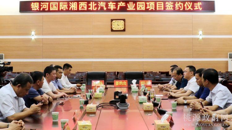 9月17日下午,桃源县县长庞波与银河国际有限公司董事长俞明签约,标志着银河国际湘西北汽车产业园项目正式落户桃源县。